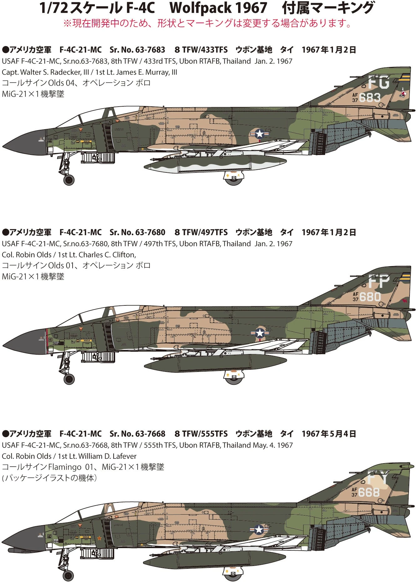 The 8th Tactical Combat Wing, commonly known as “Wolfpack,” was deployed at the Ubon base in Thailand, which was the U.S. Air Force’s front line base in Vietnam from December 1965, at the beginning of the Vietnam War. On January 2, 1967, Operation Boro was deployed to eliminate MiG fighters that posed a threat in the so-called “North Bomb,” and seven new MiG21 fighters, which had just been paid by the Soviet Union from the fall of the previous year, were deployed for one day, but were shot down. The F-4C under the command of the Wolfpack shot down a total of 22 MiG fighters before switching to the D type.