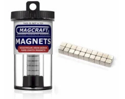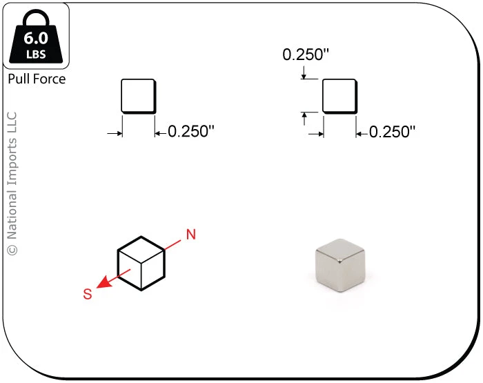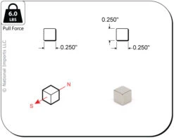 These magnets are 0.250 inch (6.4mm) cube. They are composed of grade 40 neodymium iron boron magnetic material and are plated in nickel-copper-nickel for a shiny corrosion resistant finish. Their individual pull force is approximately 6 lbs. Max Working Temperature – 176 F (80 C).