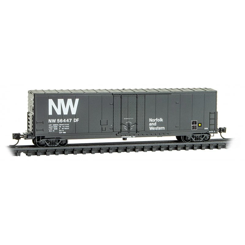 This B-18 class plug-door 50’ boxcar with Barber Roller Bearing trucks was built in 1963 by Pullman-Standard and featured DF loaders and a Hydroframe 60 cushioned underframe. It was painted in the 1971 scheme. Norfolk & Western was known as the “King Coal” line, and was a Class 1 railroad headquartered in Roanoke, Virginia.