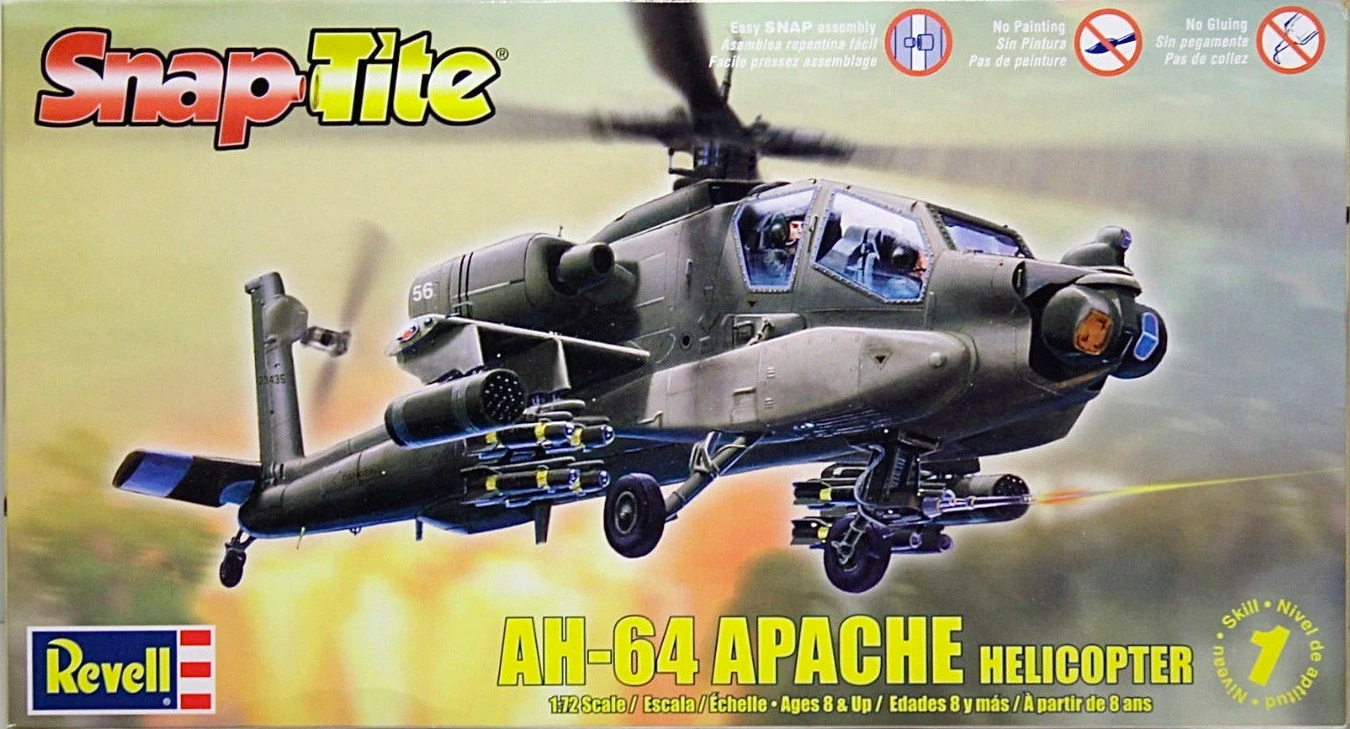 This high-tech U.S. Army combat machine carries advanced electronic equipment. It’s heavily armed with a 30mm ‘chain gun’, Hellfire missiles and dual 2.75 inch rockets pods. Features: Easy snap-together construction, parts molded in color, special decal sheet with one set of authentic markings and a bonus set of custom graphics such as lightning bolts and shark jaws. Paint and glue not needed.