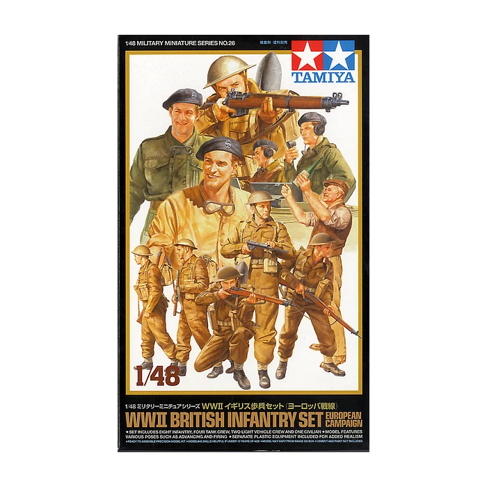 Fifteen figures of WW.II British infantry and tank crew seen on North West European theater. All figures has its roots in 1/35 scale models. Four tank crews & a peasant from Churchill Mk.VII (TAM35210) & Centaur C.S. (TAM35232), Five infantry walking figures are from British Infantry on patrol(TAM35223), Two light vehicle crew from Universal Carrier (TAM35249) and three firing infantry are of the new tooling. Two sprues of accessories for infantry weapons and individual equipment are included. The surplus equipment can be transferred in a diorama to the tank you decide to use, as it’s the tank that really needs this kind of small parts for “reality”.